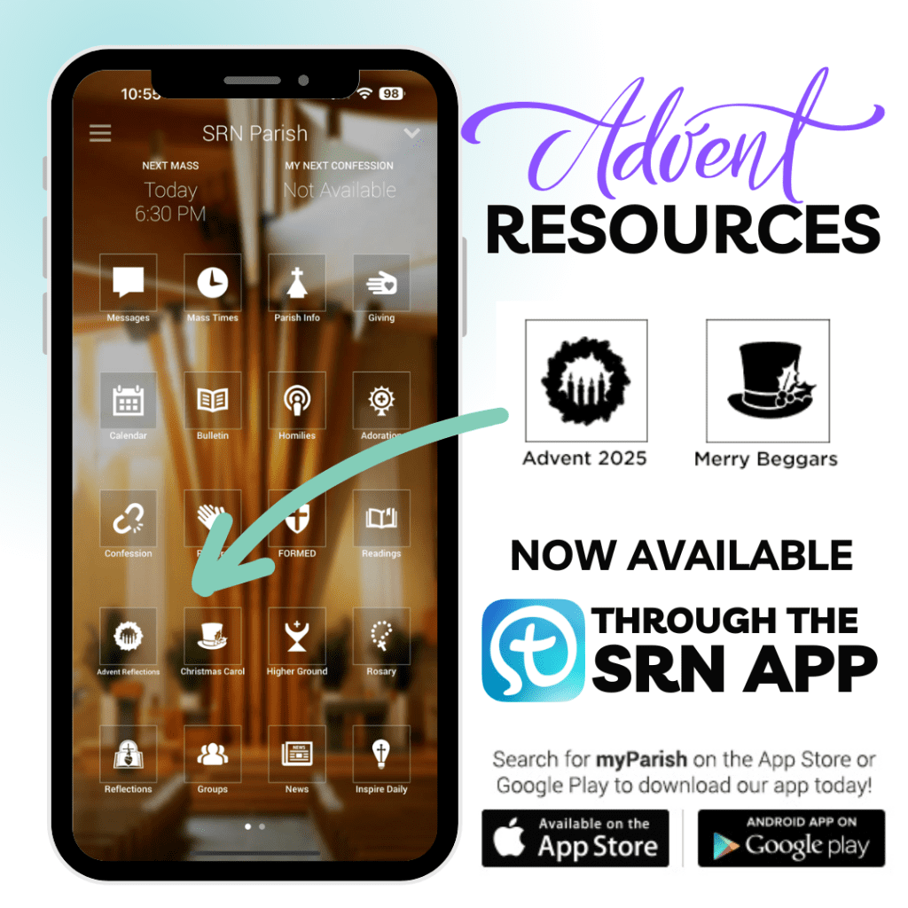 Our Advent Penance Service will begin with the Liturgy of the Word in the sanctuary (approximately 20 minutes) followed by individual confession throughout our SRN campus. Multiple priests (10-12) in addition to Father Tony will be available that evening to hear confessions. Staff and other volunteers will be on hand to help welcome and guide parishioners and guests. Printed copies of examinations of conscience for adults and children/teens will be available to help penitents prepare.