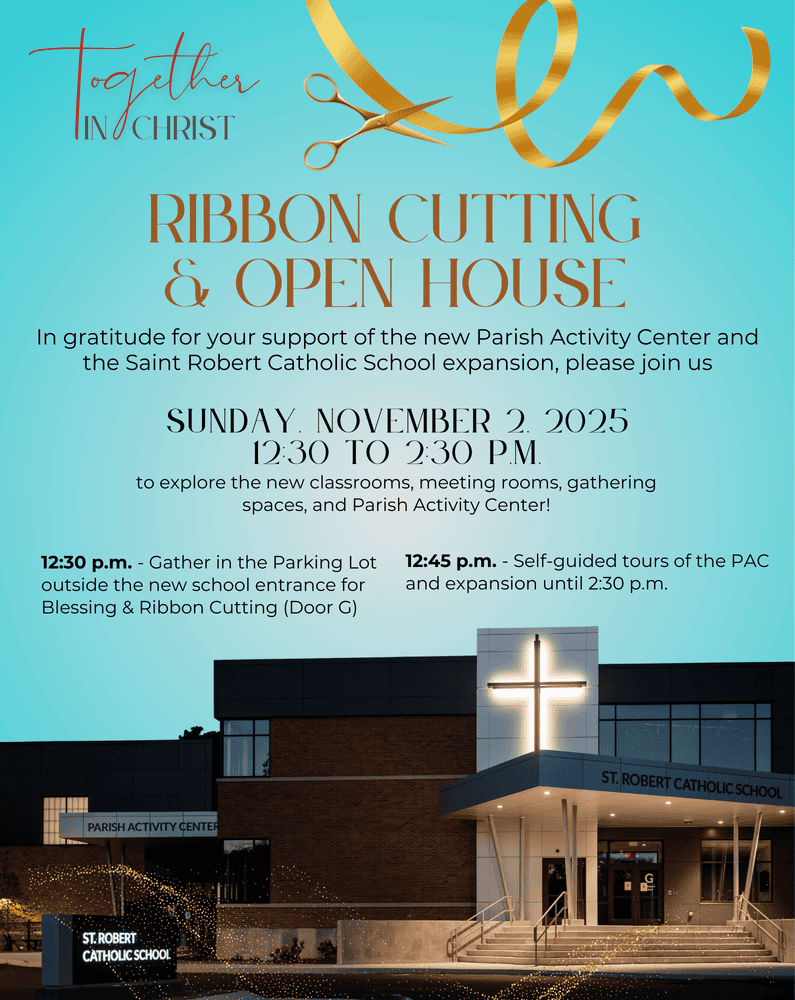 At 12:30 p.m. today, Nov. 2, join us as, together in gratitude, we celebrate the grand opening of our new school expansion and Parish Activity Center! We are excited to welcome you to witness the ribbon cutting and Father Tony’s blessing and to have you walk through the new spaces to view the fruits of 16 months of dedication and hard work. See you there!