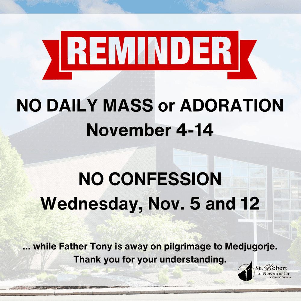 There will be no daily Masses or Eucharistic Adoration celebrated at SRN Nov. 4-14, and confessions will not be heard on Nov. 5 or 12 as Father Tony will be away on pilgrimage to Medjugorje in Bosnia.